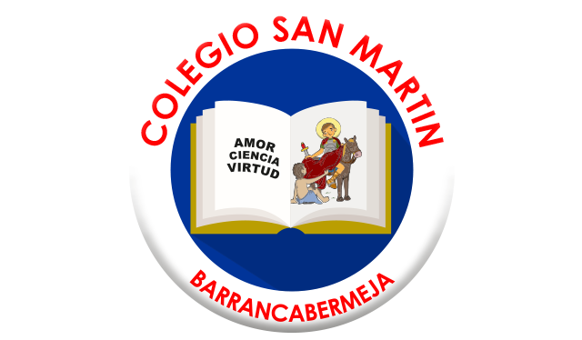 sabiduría. A su lado izquierdo los valores fundamentales que promueven la filosofía del Colegio San Martín: AMOR, CIENCIA Y VIRTUD. Al lado derecho la imagen de SAN MARTÍN DE TOURS. Estos elementos descansan sobre una base decorada con el nombre de la institución y la ciudad.